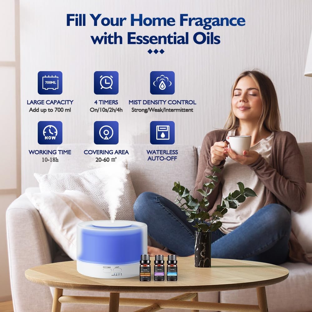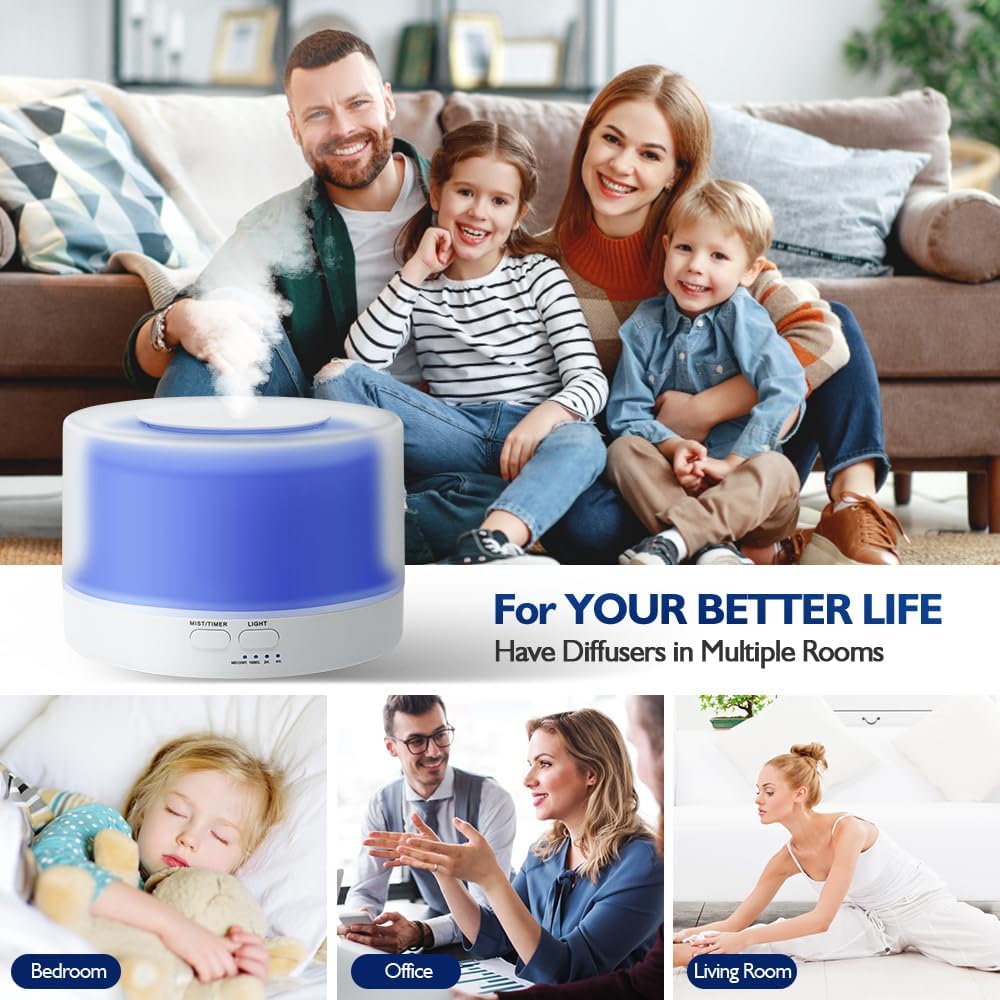 - 【500ml Diffuser for More Space】Large capacity and more mist. Thanks to high-performance ultrasonic mist technology, this aroma diffuser can emit stronger mist. Refreshes and moisturizes the air for rooms of 10 - 70 m². Use it to improve your home's atmosphere quality, cover the smell of pets or smoking, and protect your family from excessively dry season, dust, and more! Ideal for salon, SPA, bedroom, living room, nursery, office, and so on.